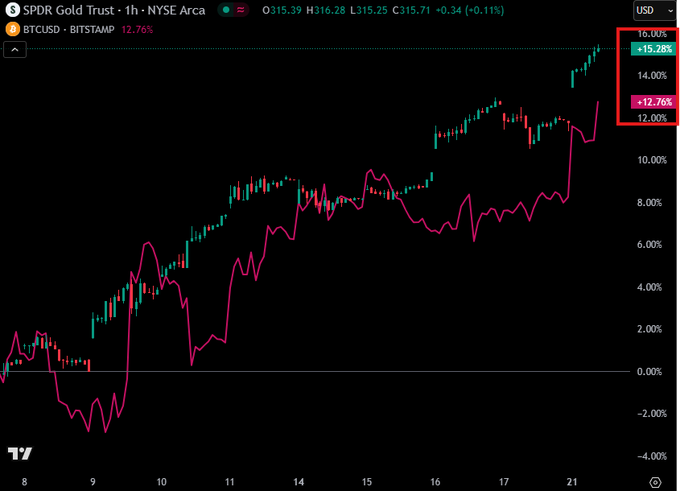 В своем анализе трейдинговый ресурс The Kobeissi Letter, тем не менее, придерживается нарратива «сначала золото, потом биткоин».