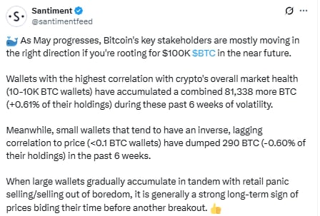 Аналитики Santiment заявили о накоплении биткоинов ключевыми игроками на рынке. По их данным, адреса, которые больше всего коррелируют с общим состоянием крипторынка (владельцы от 10 BTC до 10 000 BTC), за последние шесть недель накопили еще 81 338 BTC.