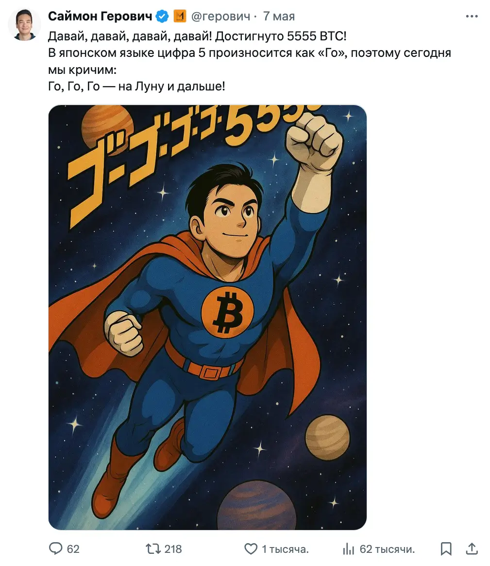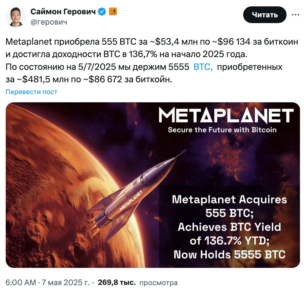 7 мая компания, акции которой котируются в Токио, сообщила, что потратила 53,4 миллиона долларов на приобретение 555 BTC по средней цене 96 134 доллара. По словам генерального директора Саймона Геровича, теперь у компании есть 5555 BTC, купленных за 481,5 миллиона долларов по средней цене 86 672 доллара за биткоин.
