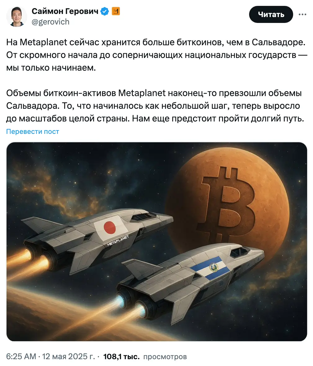 «Metaplanet теперь владеет большим количеством биткоинов, чем Сальвадор. От скромного начала до соперничества с национальными государствами, мы только начинаем», — сказал генеральный директор Саймон Герович на X после последнего объявления о покупке.
