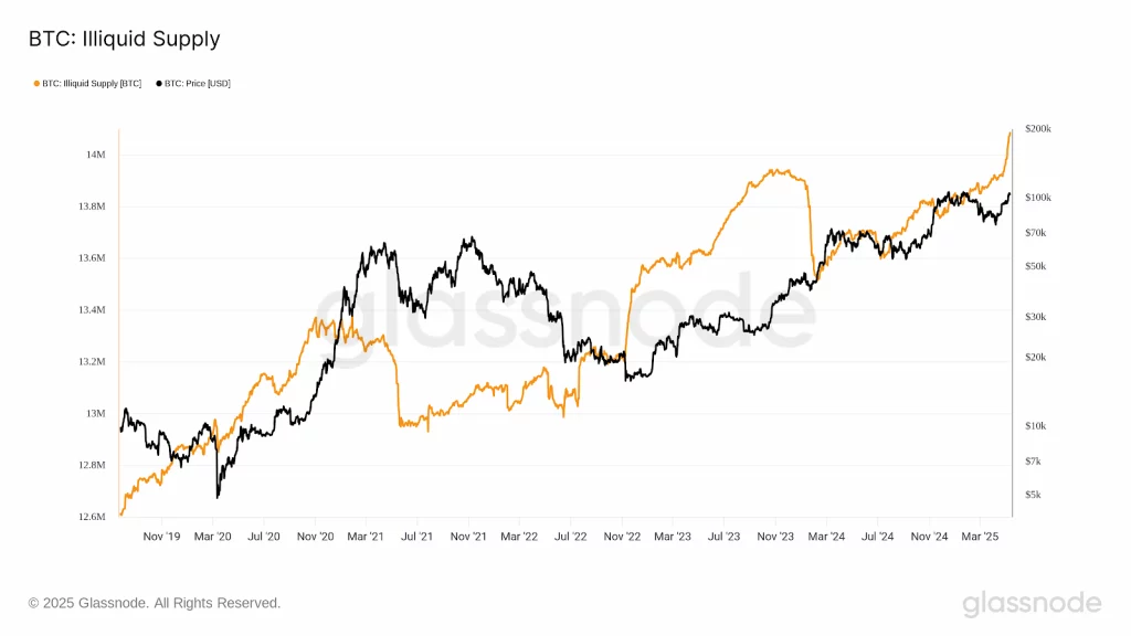 График ниже иллюстрирует рост «неликвидного предложения» биткоина, подтверждающий гипотезу о накоплении средств на кошельках крупных инвесторов.