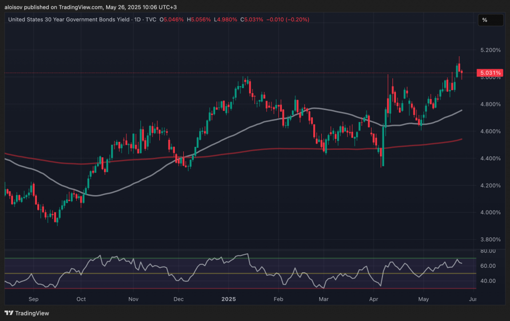 Доходность американских облигаций растет так стремительно, что заставляет серьезно задуматься даже опытных трейдеров. 22 мая доходность 30-летних облигаций США достигла 5,15% — максимума с октября 2023 года. Рост доходности показывает, что инвесторы хотят получать больший процент за то, что дают деньги в долг американскому правительству — они больше не считают эти вложения такими же надежными, как раньше. А ведь когда-то эти бумаги считались самыми безопасными активами в мире.