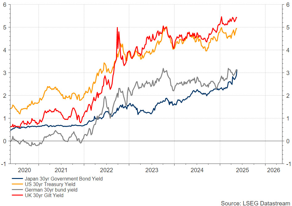 Банк Японии в марте 2024 года начал повышать ставки с -0,1% до нынешних 0,5%. С апреля доходность 30-летних японских облигаций подскочила на 100 базисных пунктов до исторического максимума в 3,1%. Премьер-министр Сигэру Исиба (Shigeru Ishiba) 19 мая даже предупредил парламент, что положение его задолженного правительства «хуже, чем в Греции». При соотношении долга к ВВП в 260% это звучит особенно пугающе.