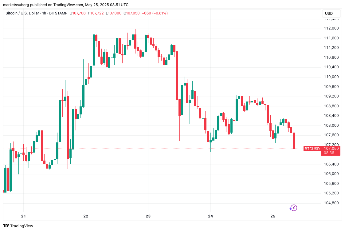 Согласно данным TradingView, BTC/USD завис вблизи локальных минимумов последних дней. После того как заявления Трампа о 50-процентных пошлинах на импорт из ЕС спровоцировали резкое снижение, рынок так и не оправился: зона $112,000 по-прежнему остаётся недостижимым максимумом.