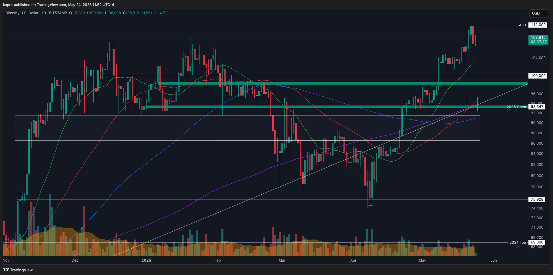 «На дневном графике биткойна сходятся макротрендовая линия и две ключевые скользящие. Все они проходят в районе годового открытия 2025 года — примерно на уровне $93,500. Пока BTC торгуется выше — бычий тренд жив», — отметил он.