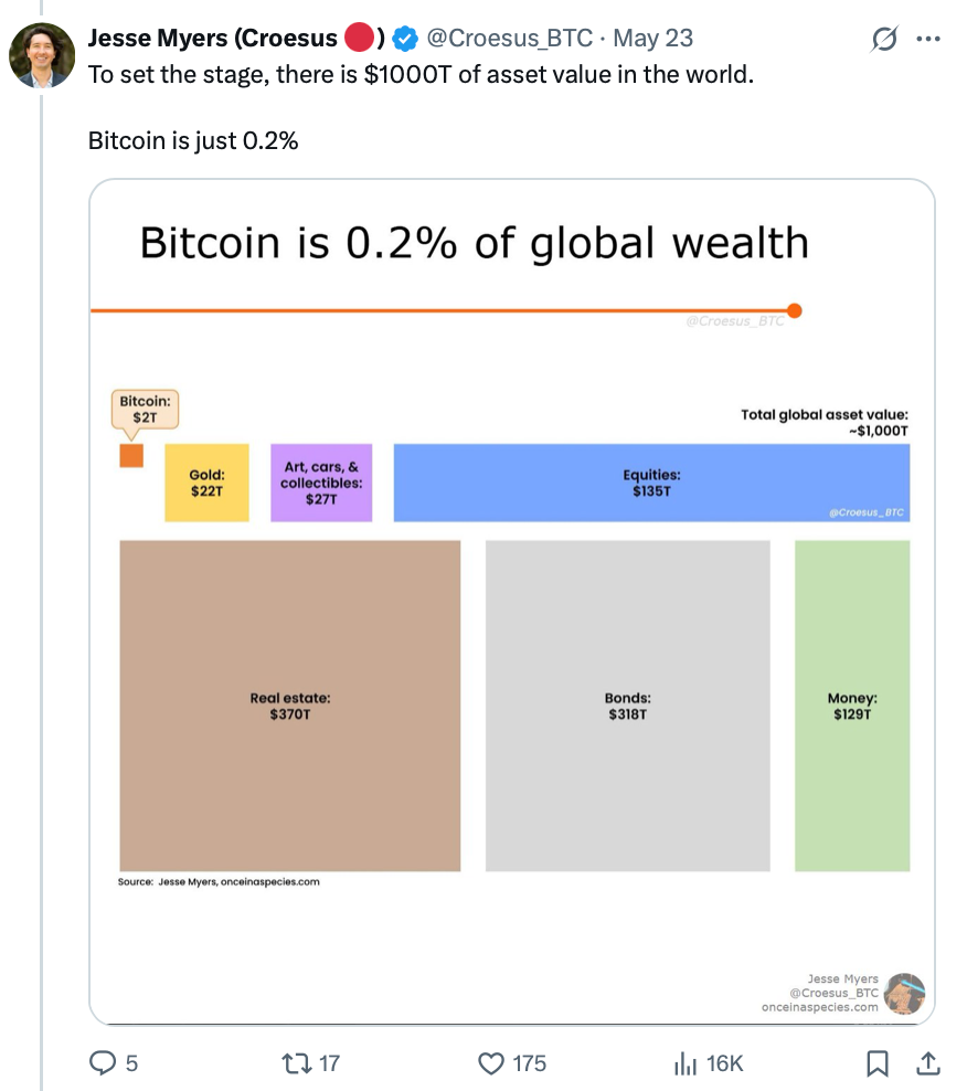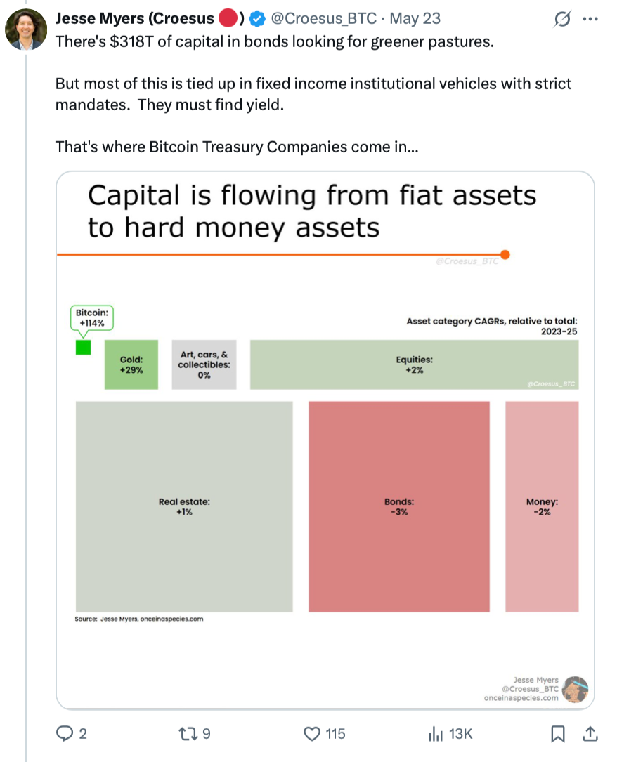 «Компании, занимающиеся казначейством биткоинов, будут держать 50% всех BTC, гораздо больше, чем большинство биткоинеров готовы представить», — сказал Джесси Майерс в ветке X 23 мая.