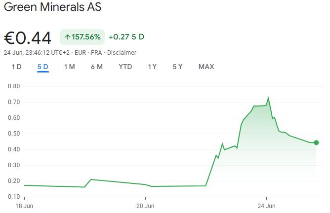 Акции Green Minerals закрылись с ростом на 300% в понедельник после объявления о сделке, поднявшись до 68 евроцентов (79 центов); однако во вторник цена акций упала и закрылась более чем на 34% до 44 евроцентов (51 цент), показывают данные Google Finance.