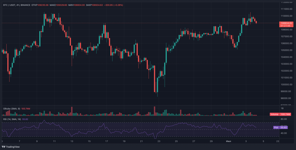 Еще утром 3 июля первая криптовалюта уверенно двигалась к психологически важному уровню $110 300, но «хорошие» цифры по рынку труда моментально остудили пыл быков. Данные показали, что в июне в США было создано больше рабочих мест, чем прогнозировали аналитики, а безработица упала сильнее ожидаемого.