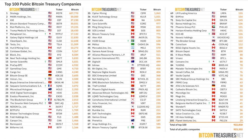 100 крупнейших публичных компаний, владеющих биткоинами, включая Twenty One Capital (XXI). Источник: BitcoinTreasuries.NET