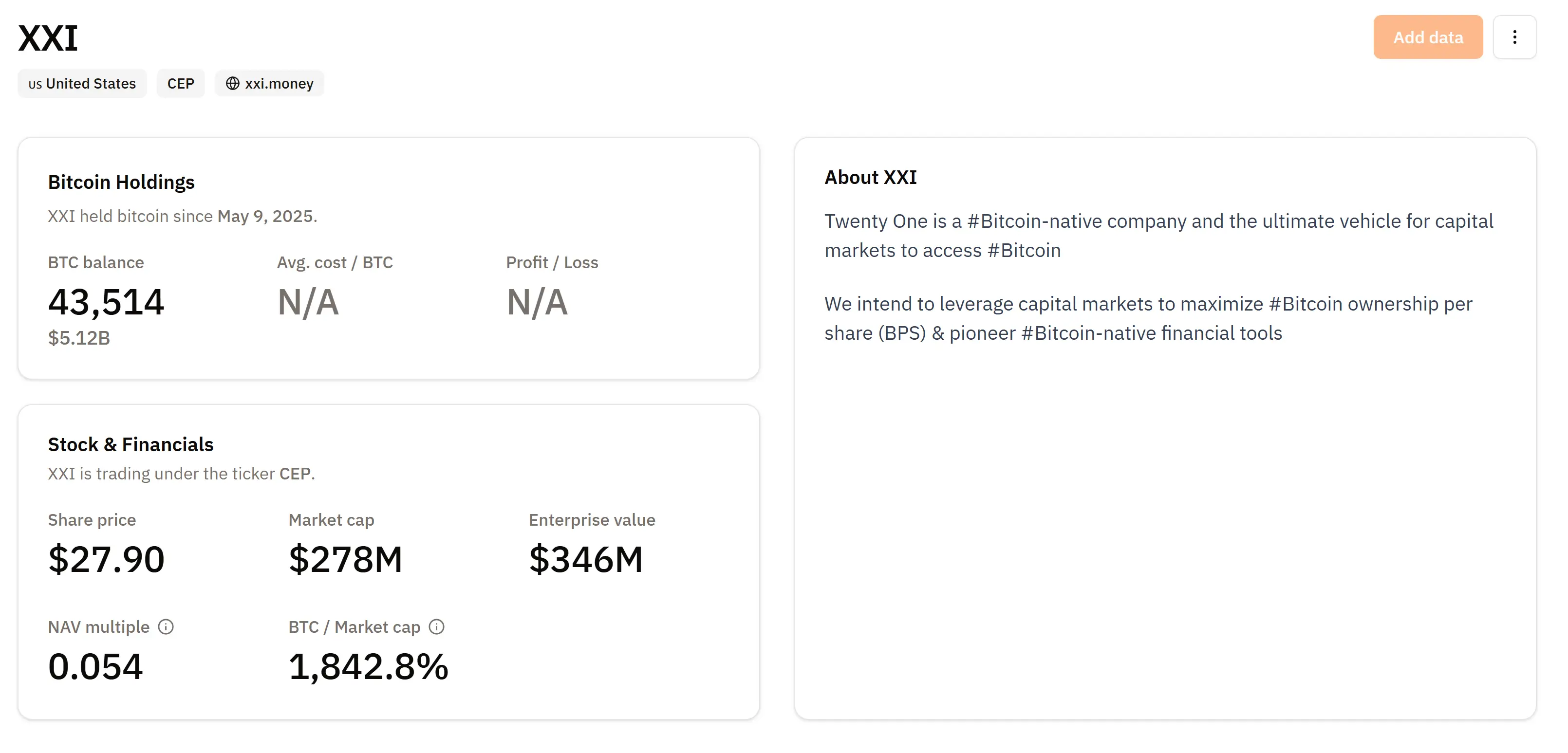 Twenty One Capital владеет более чем 43 000 BTC. Источник: BitcoinTreasuries.Net