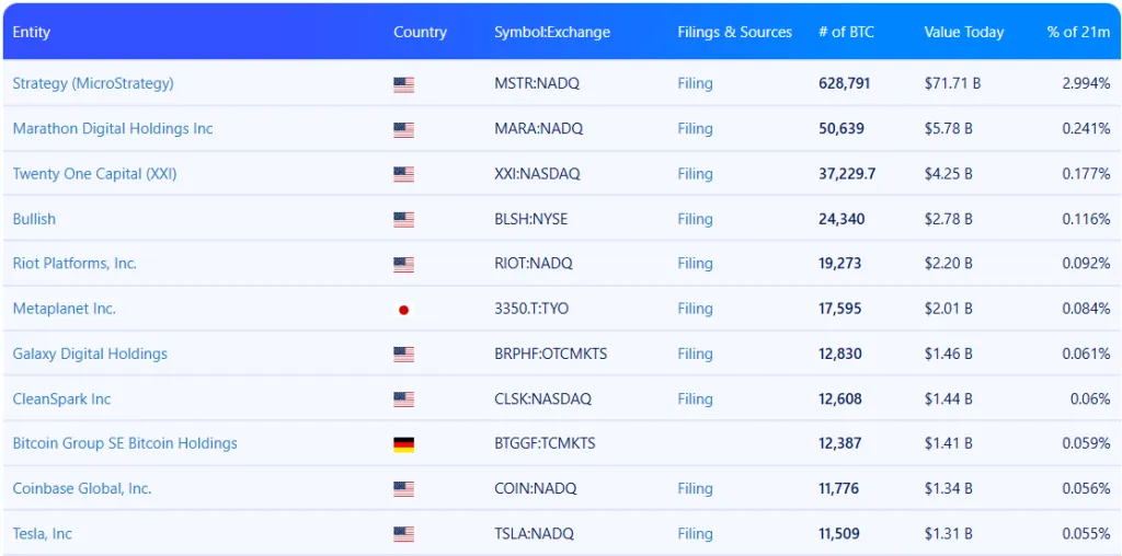 Согласно BitcoinTreasuries, публичные компании суммарно удерживают 932 494 BTC. На Strategy приходится 628 791 BTC стоимостью $71,71 млрд — это 3% от общей эмиссии цифрового золота.