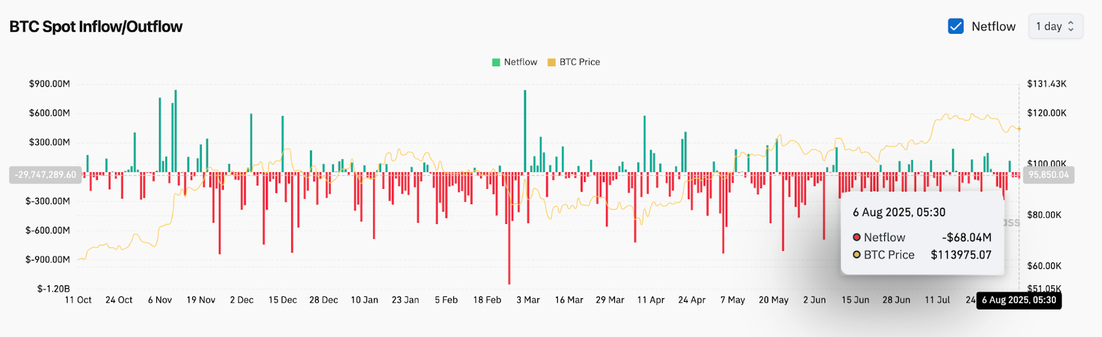 | Spot Netflow (6 августа) | -68,04 млн долларов США (умеренный отток) |
