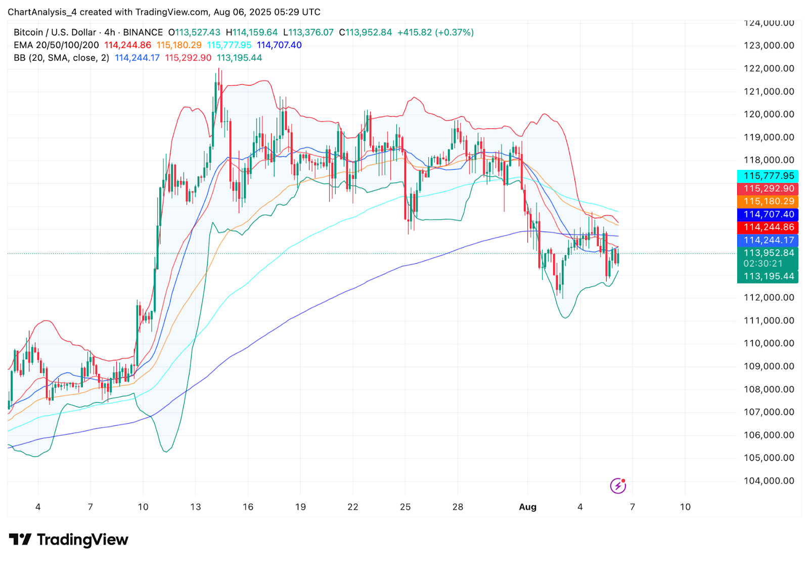 Полосы Боллинджера на 4-часовом графике снова начинают немного расширяться, указывая на возможное начало новой фазы роста волатильности. Однако без решительного прорыва средней полосы или закрытия выше 100-дневной экспоненциальной скользящей средней на уровне $115 777 текущая попытка восстановления остаётся уязвимой.