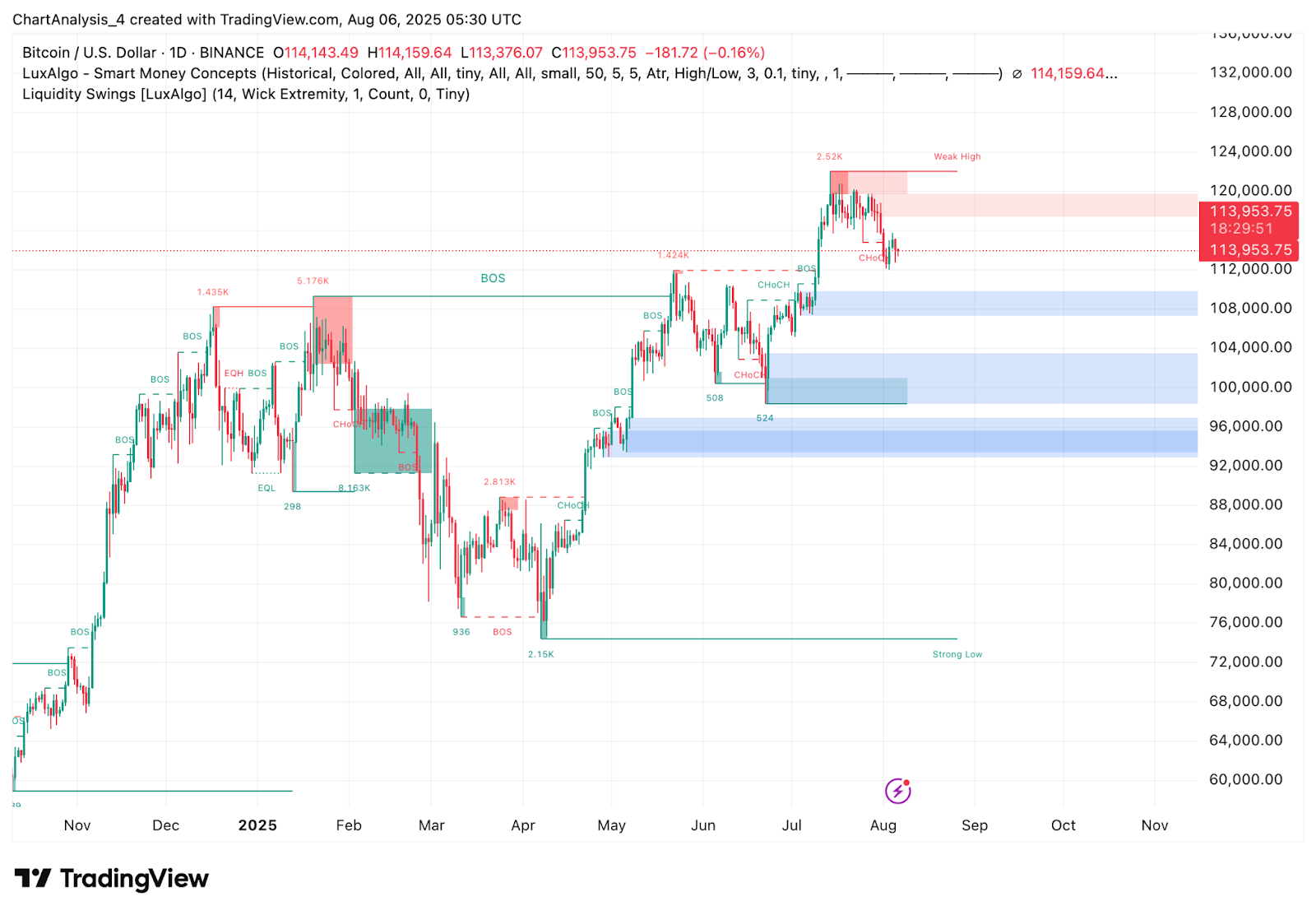 | Умные деньги CHoCH (1D) | Слабый прорыв около $114 200 |