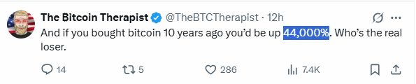 Аналогичным образом, «The Bitcoin Therapist» утверждает, что десятилетний прогноз показывает рост биткоина на 44 000%, подразумевая, что недавний рост золота по сравнению с этим незначителен.