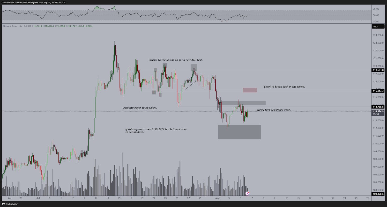 Хотя текущая структура выглядит конструктивной, Ван де Поппе предупредил, что падение ниже $113 000 сведёт на нет бычий тренд и, возможно, приведёт к новым локальным минимумам. Ключевая зона накопления остаётся между $110 000 и $112 000, которую он назвал «блестящей областью для накопления», если биткоин снова туда вернётся.