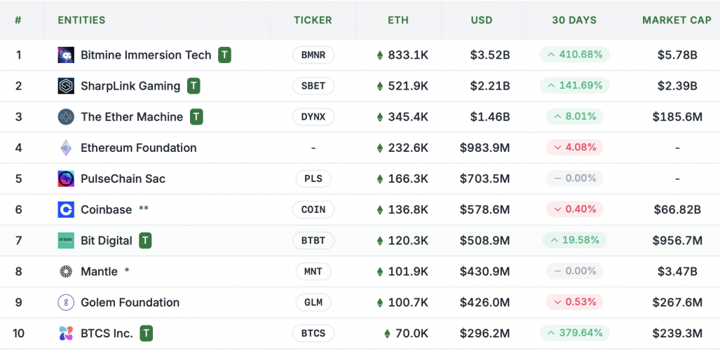 BitMine владеет 833 100 ETH стоимостью $3,2 млрд — четвертый по величине запас среди всех публичных компаний, держащих криптовалюты. SharpLink и The Ether Machine держат ETH на $2 млрд и $1,34 млрд соответственно.