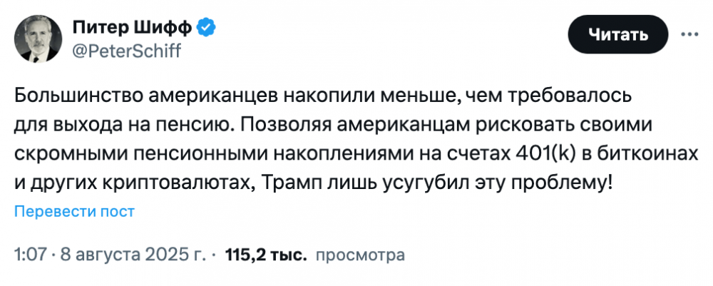 Не все эксперты поддержали инициативу. Известный критик криптовалют и сторонник золота Питер Шифф заявил, что указ лишь усилит проблему недостаточных пенсионных накоплений в США.
