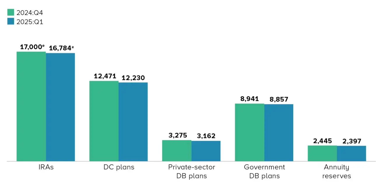 Данные Института инвестиционных компаний и Совета управляющих Федеральной резервной системы показывают, что объем пенсионных активов США в первом квартале 2025 года достиг $43,4 трлн. Из них более $12 трлн приходится на планы с установленными взносами, включая $8,7 трлн в счетах 401(k).