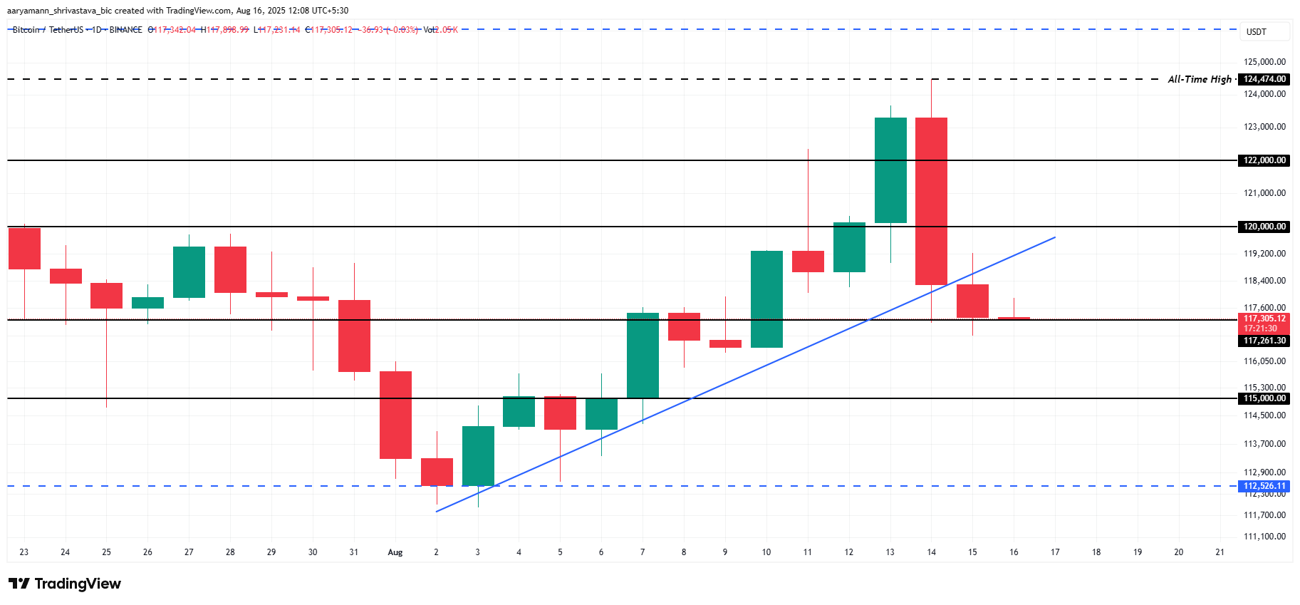 Цена биткоина росла в течение месяца, но за последние 24 часа импульс ослаб, и BTC упал до $117 305. Это снижение произошло, поскольку цена опустилась ниже линии восходящего тренда, сигнализируя о смене настроений на рынке.
