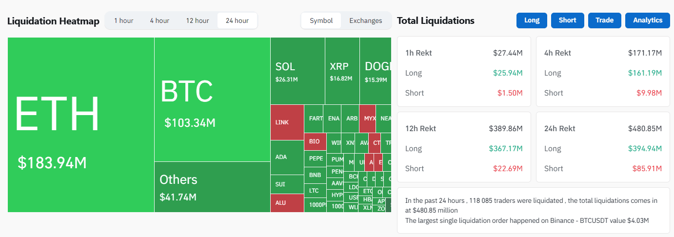 Суточный объем ликвидаций составил $480,85 млн. По позициям превалируют длинные, по активам — Ethereum и биткоин. Под принудительное закрытие позиций попали 118 085 трейдеров.