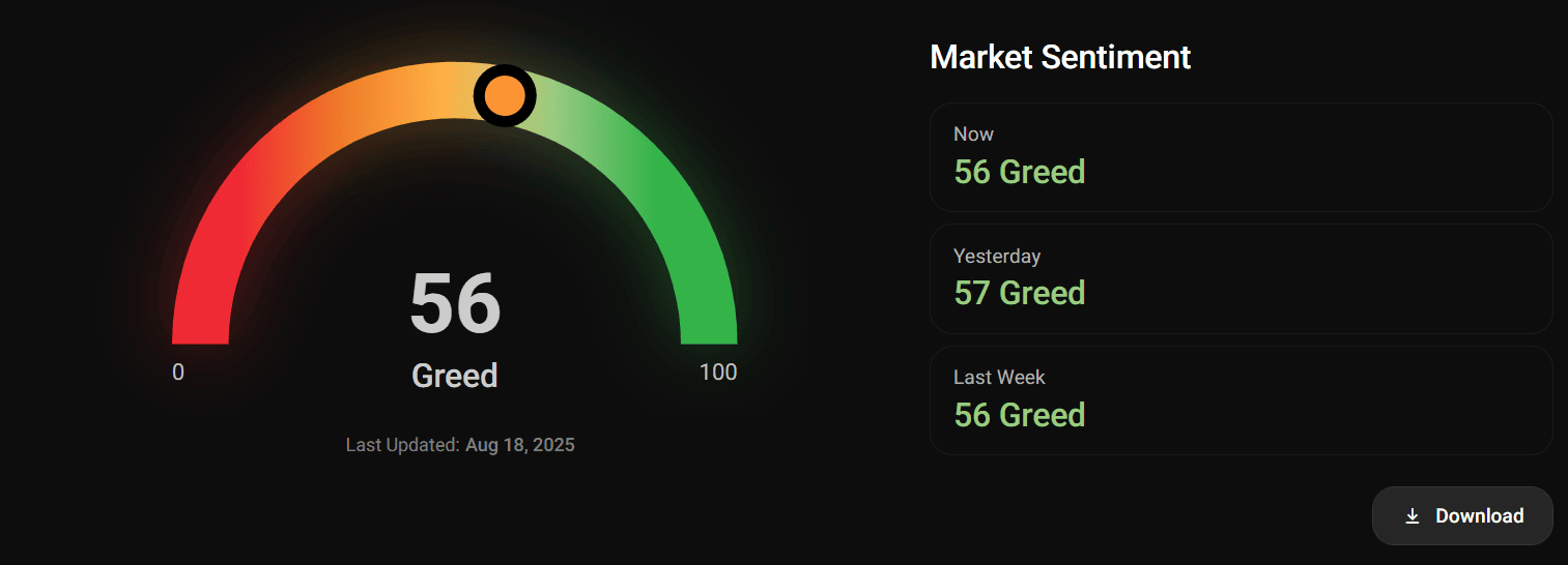 Коррекция на крипторынке пока что не нашла отражения в глобальном настроении инвесторов. Индекс страха и жадности по-прежнему указывает на стремление к накоплению, а не продаже: