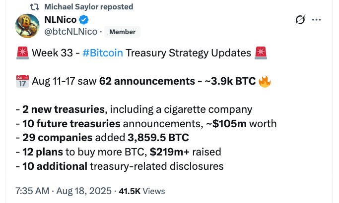 Согласно ретвиту Сэйлора от NLNico, компании биткоин-казначейств по всему миру в период с 11 по 17 августа в совокупности приобрели 3900 BTC и сделали 62 соответствующих объявления.
