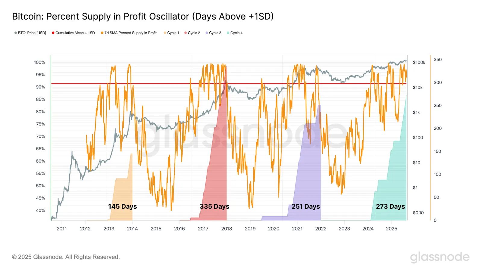 С 14 августа, когда первая криптовалюта обновила ценовой рекорд выше $124 000, долгосрочные инвесторы активно фиксировали прибыль. Объем продаж сопоставим с пиковыми значениями всех предыдущих циклов, за исключением периода 2016-2017 годов.