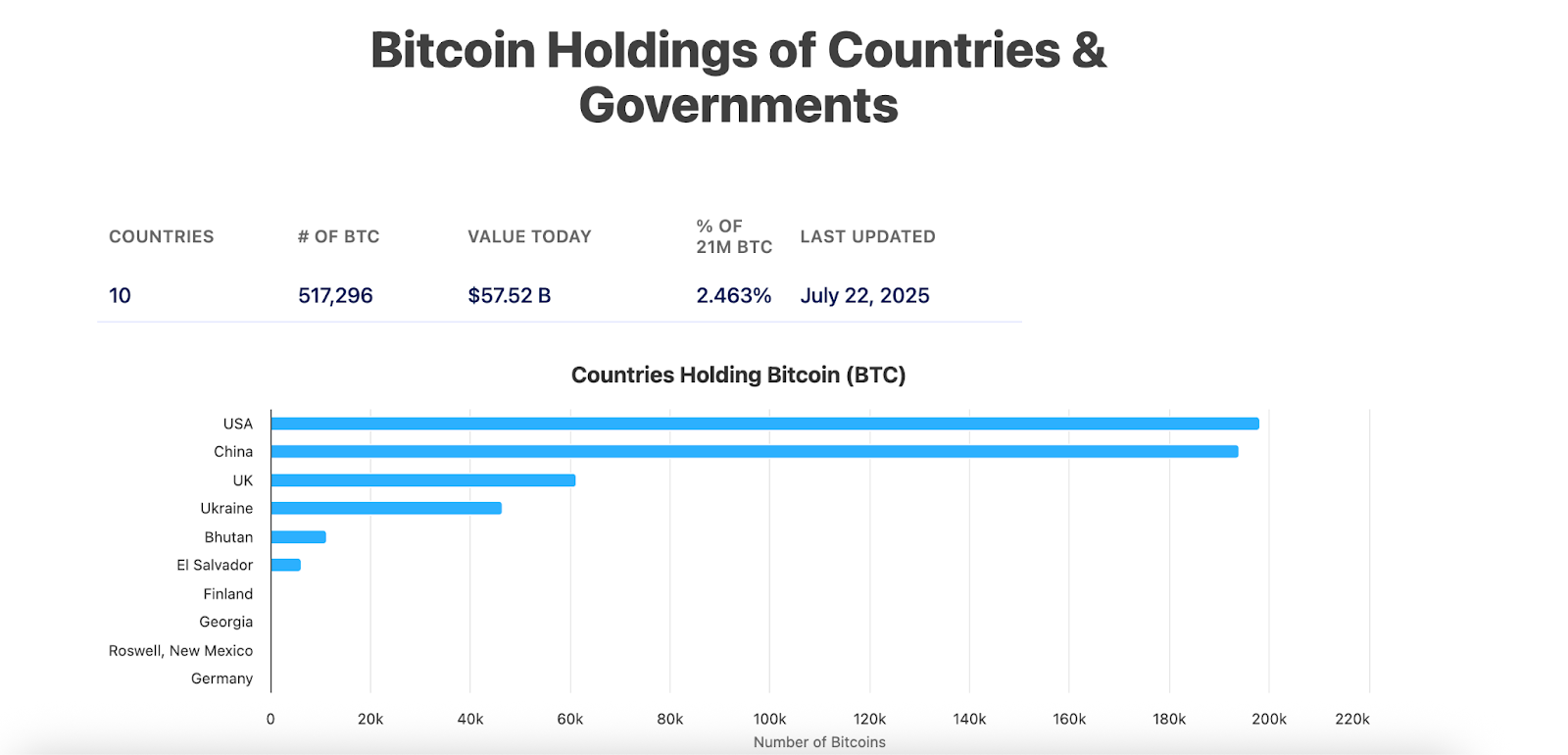 Под управлением государств по всему миру находится 517 296 BTC — 2,46% от общего предложения биткоина. США и Китай лидируют за счет конфискованных активов.