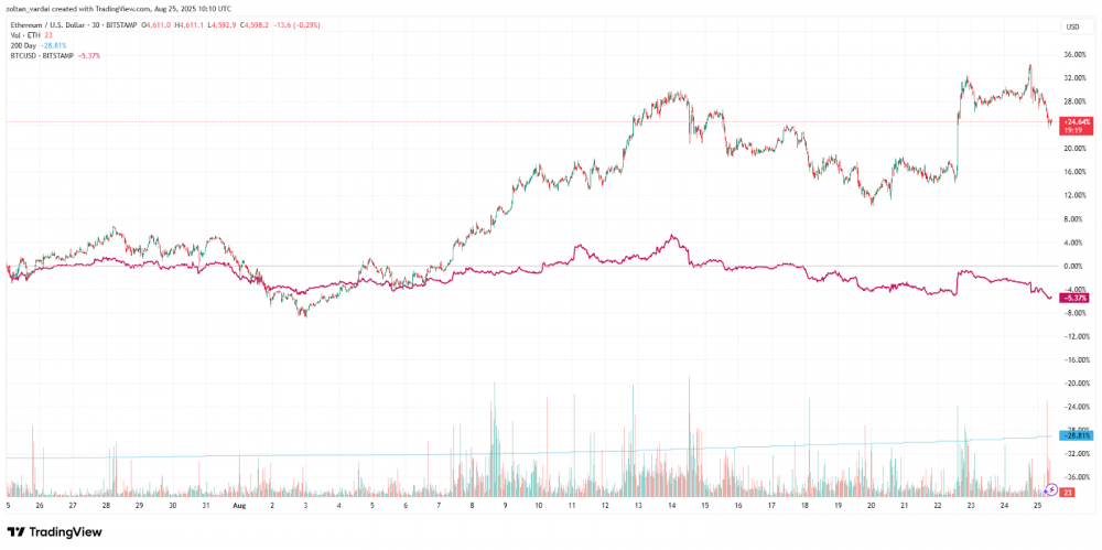 По данным TradingView, спрос китов на Ethereum за последний месяц увеличился: цена Ethereum выросла почти на 25%, превзойдя падение Bitcoin на 5,3% за последние 30 дней.