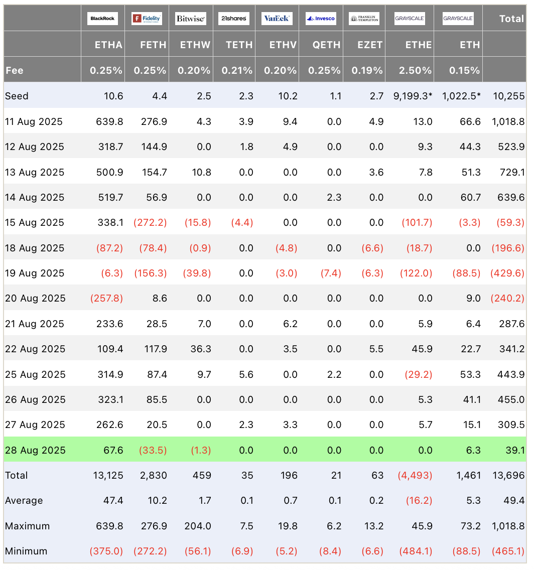 А вот спотовые Ethereum-ETF показали себя гораздо лучше — совокупный приток составил $1,24 млрд, более чем в два раза превысив показатели биткоин-фондов за те же четыре торговых дня. Фонды Ethereum не видели дня чистого оттока инвестиций с 20 августа и зафиксировали более $4 млрд притока в этом месяце, что составляет 30% от общего притока с момента запуска продуктов 13 месяцев назад.