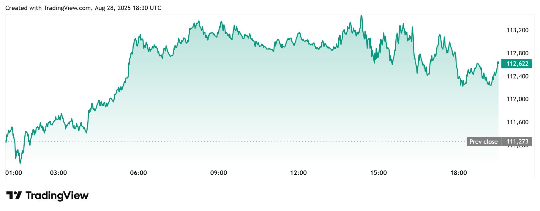 Анализ биткоина JPMorgan относительно золота совпал с небольшим ростом цены биткоина перед быстрым откатом. Согласно рыночным данным TradingView, в четверг курс биткоина вырос на 2,3%, достигнув максимума около $113 479, после чего откатился примерно на 1%, достигнув отметки около $112 272.