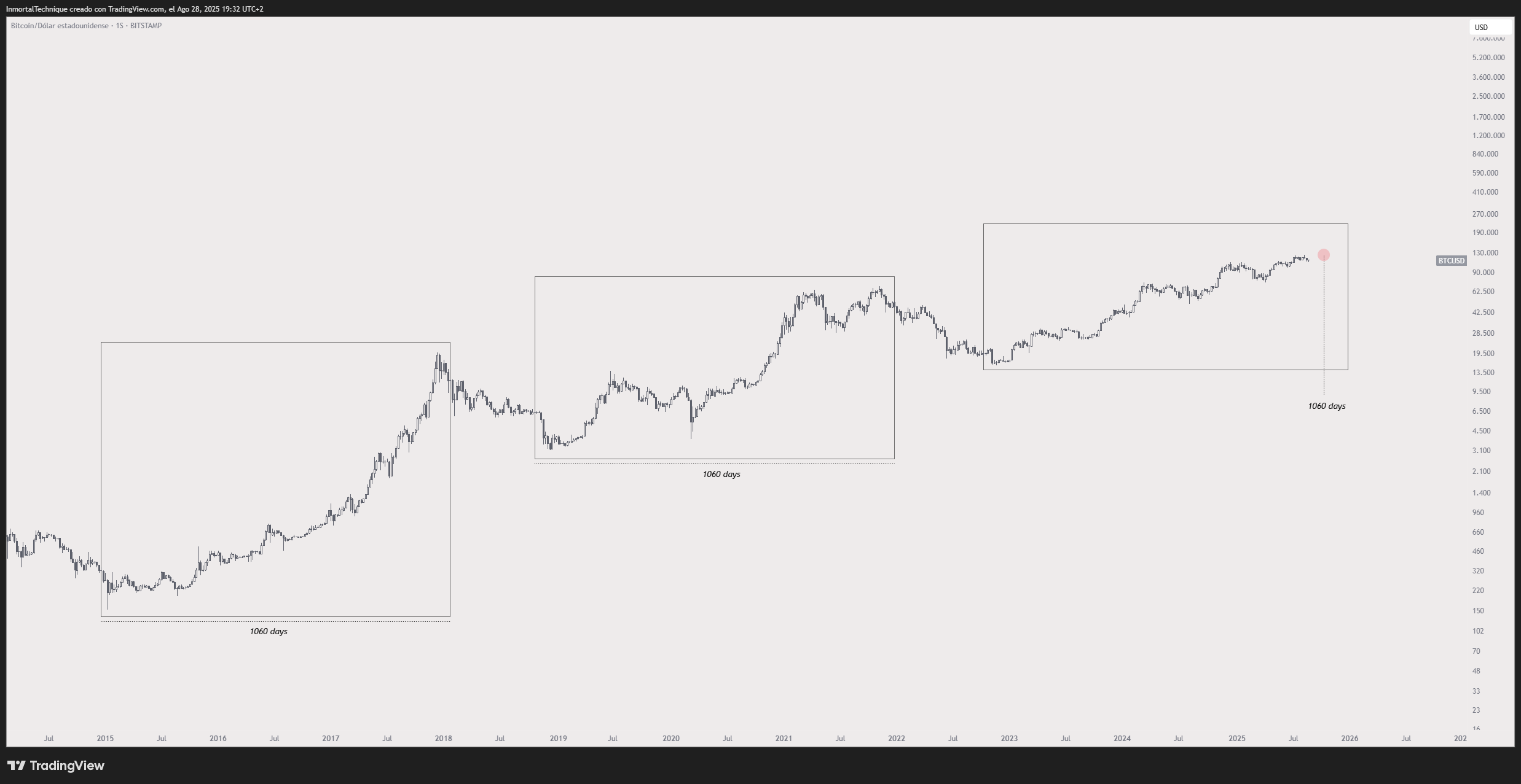 Многие пессимистичные прогнозы не сбылись, а текущее ралли длится уже третий год. Однако сейчас инвесторов больше волнует не его продолжительность, а масштаб движения. Так, аналитик Inmortal отмечает, что предыдущие бычьи циклы длились примерно 1060 дней.