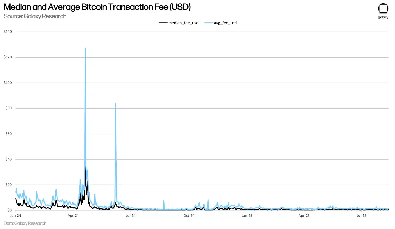 Согласно отчету Galaxy Digital, ежедневные комиссии за транзакции в сети Биткоин снизились более чем на 80% с апреля. По состоянию на август 2025 года почти 15% блоков являются «бесплатными», то есть добываются с минимальной комиссией или без нее, всего один сатоши за виртуальный байт или меньше.