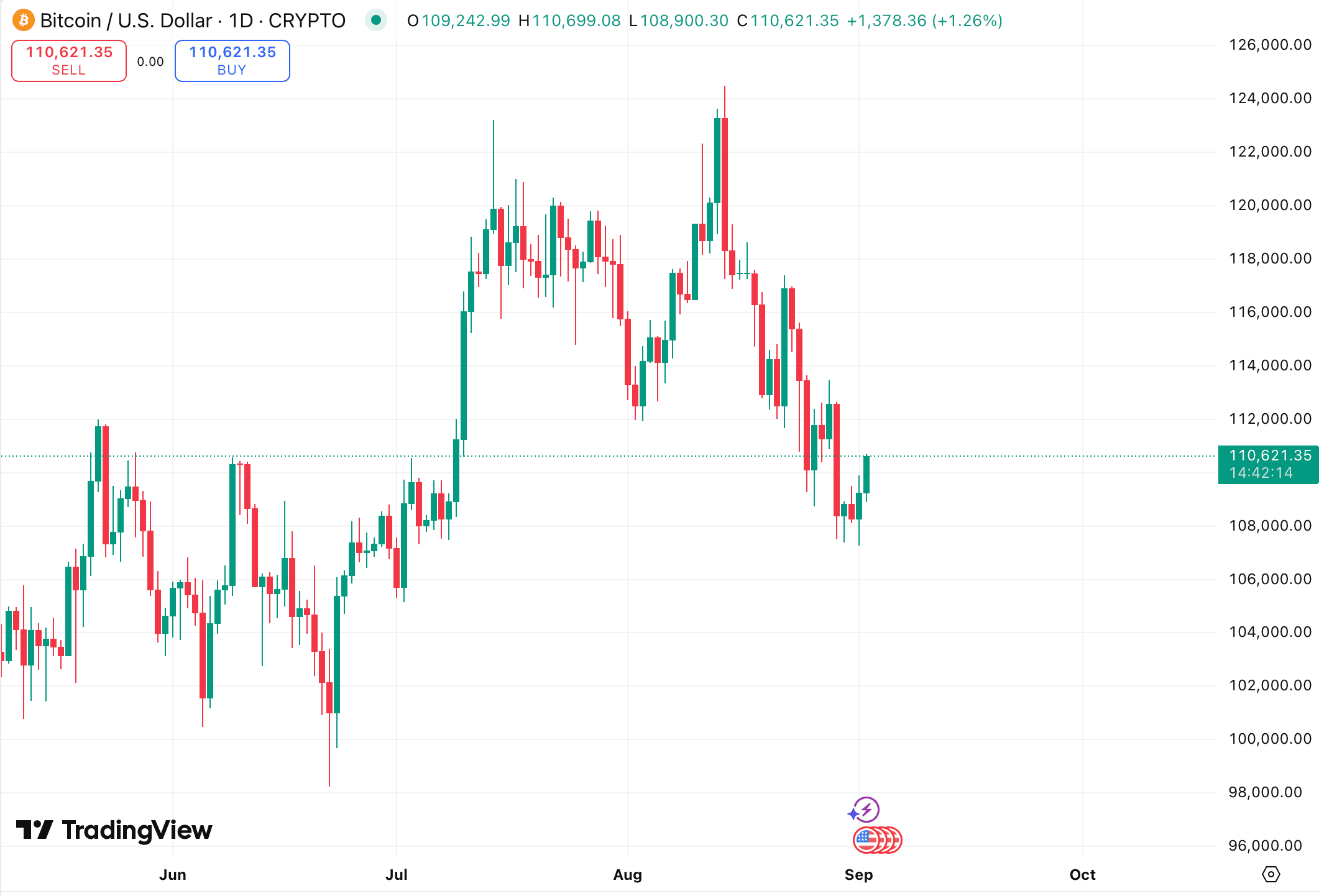 Напомним, что курс биткоина в августе снизился на 6,5% — до менее чем $109 000, а 1 сентября торговался на уровне $107 400. По состоянию на момент написания новости первая криптовалюта стоит $110 621, что на 11% ниже исторического максимума $124 474.
