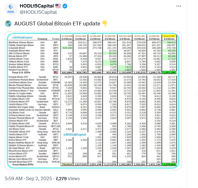 Американские биржевые фонды (ETF) для биткоина (BTC) захватили наибольшую долю: по состоянию на воскресенье их активы превысили 1,29 млн BTC во всех 11 фондах, согласно данным, опубликованным аккаунтом X HODL15Capital в понедельник.