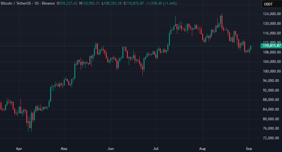 Отметим, на момент написания биткоин торгуется вблизи отметки в $110 800: