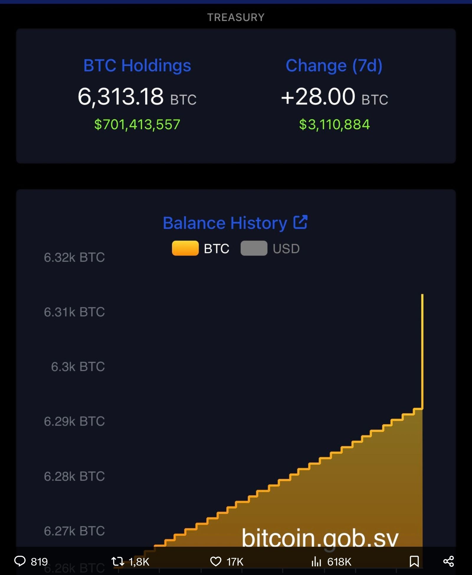 Такде Сальвадор начал последовательно скупать криптовалюту. На момент написания обзора, у страны 6 313 монет на сумму свыше $701 млн.