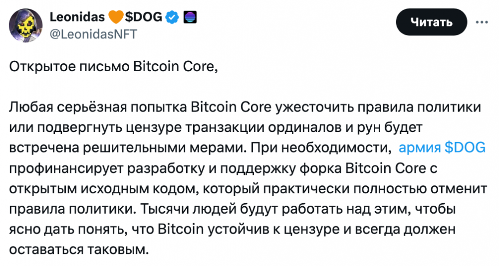 Основатель экосистемы Bitcoin Ordinals Леонидас заявил о готовности сообщества создать форк клиента Bitcoin Core. Это ответная мера на потенциальные попытки разработчиков отменить обновление, которое расширяет возможности для транзакций с Ordinals и Runes. Угроза прозвучала на фоне растущих дебатов о нефинансовых данных в блокчейне биткоина.