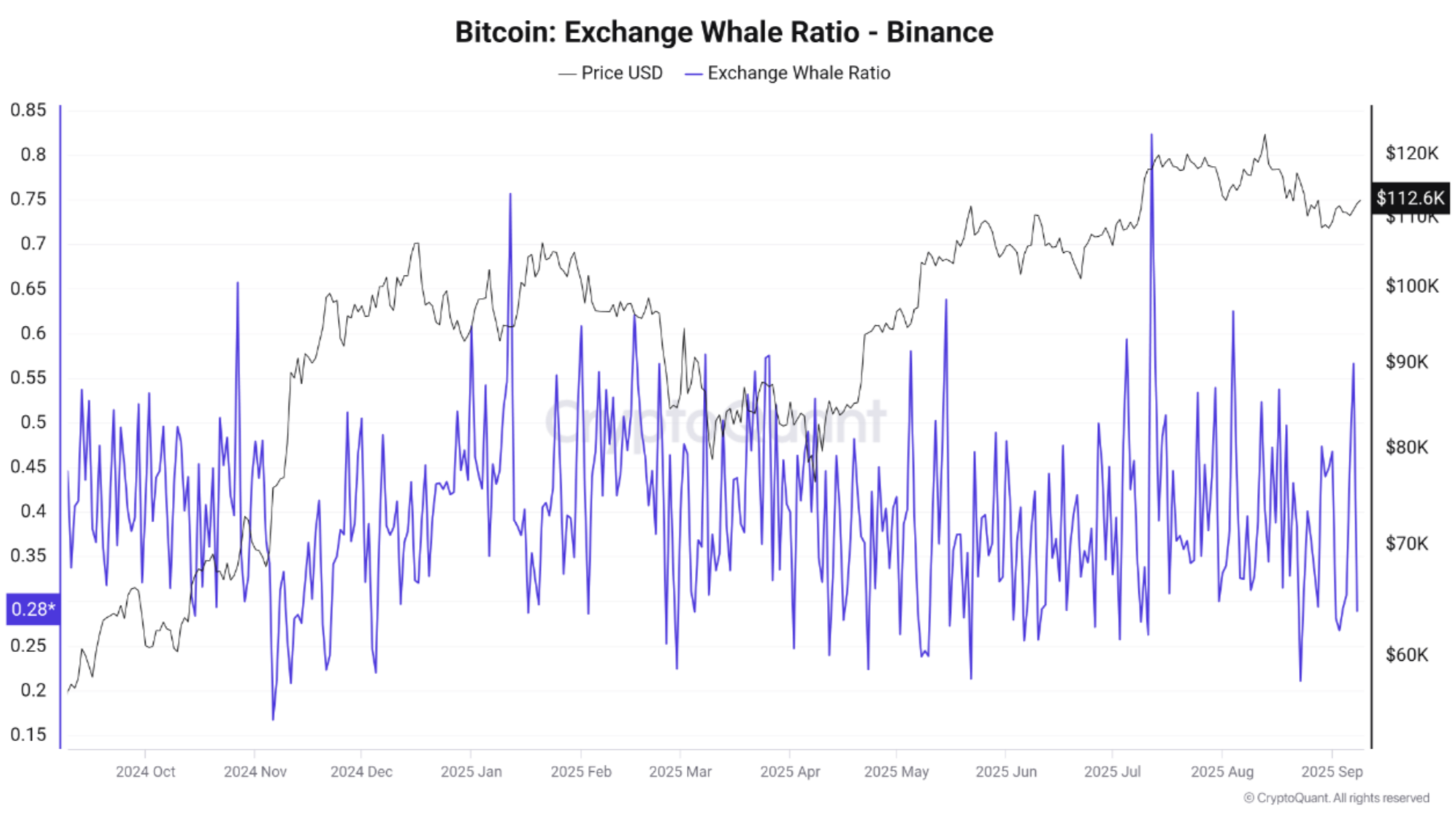 Однако за этим всплеском быстро последовало снижение показателя: 8 сентября коэффициент «китов» на бирже BTC упал до 0,28. Тем не менее цена оставалась стабильной на уровне 112 500 долларов, что говорит о том, что действия «китов» были кратковременными и не привели к распродаже BTC.