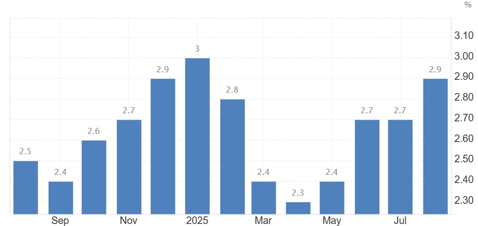 11 сентября 2025 года Министерство труда США обнародовало данные по инфляции за август. Согласно обновленным цифрам, индекс потребительских цен (CPI) в годовом измерении вырос до 2,9%.