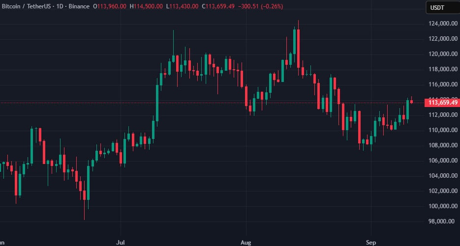 На фоне обнародованных данных стоимость первой криптовалюты снизилась ниже $114 000. На момент публикации биткоин торгуется в районе $113 600: