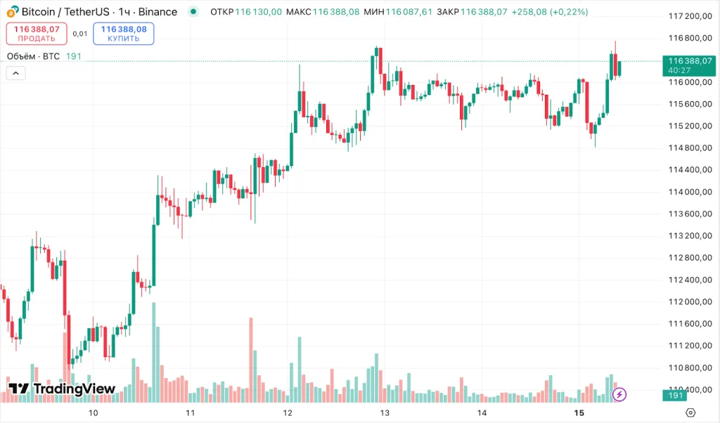 На момент написания биткоин торгуется около $116 400. За последние сутки цена цифрового золота выросла на 0,5%.