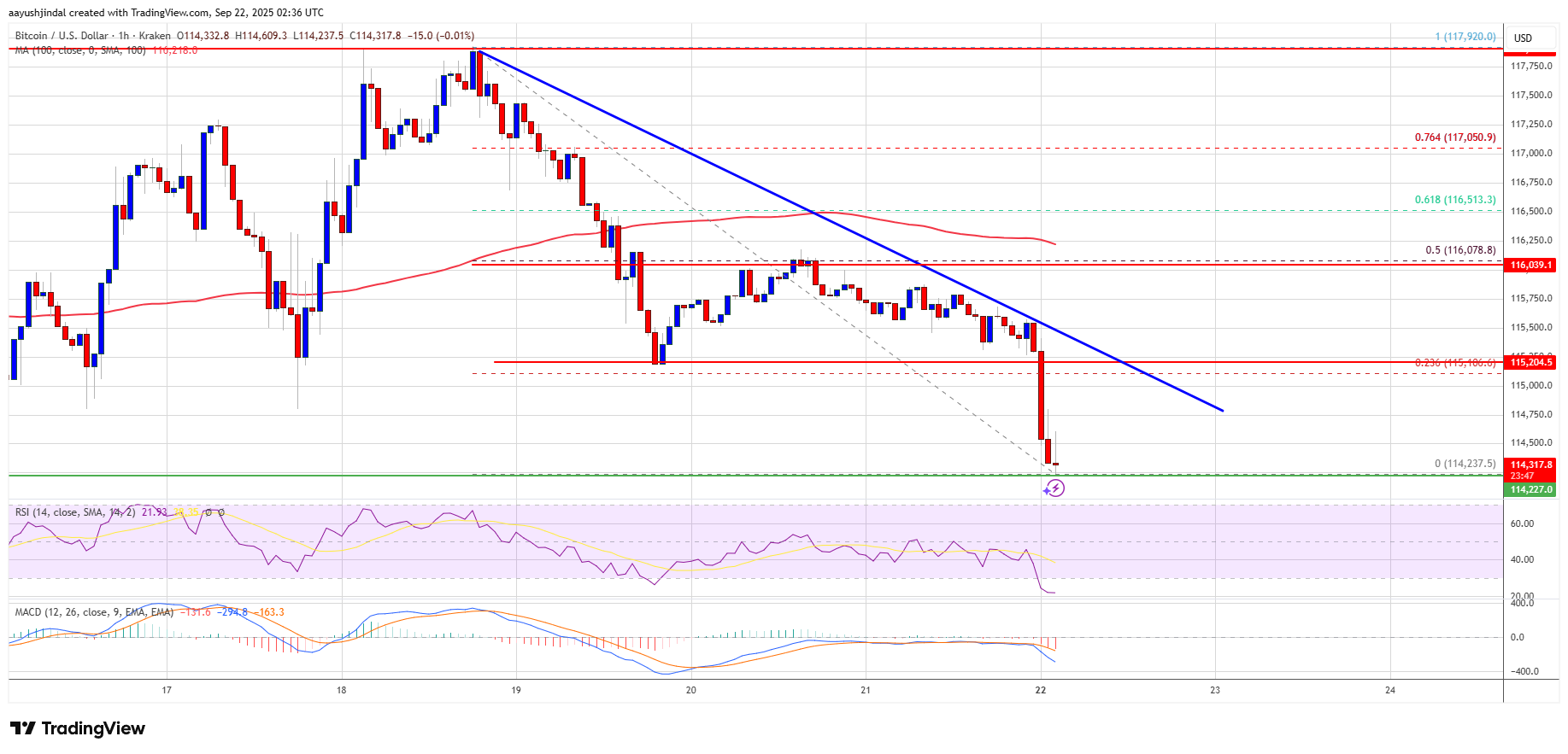 Биткоин сейчас торгуется ниже отметки в 115 500 долларов и 100-часовой простой скользящей средней. Кроме того, на часовом графике пары BTC/USD формируется медвежья линия тренда с сопротивлением на уровне 115 200 долларов.