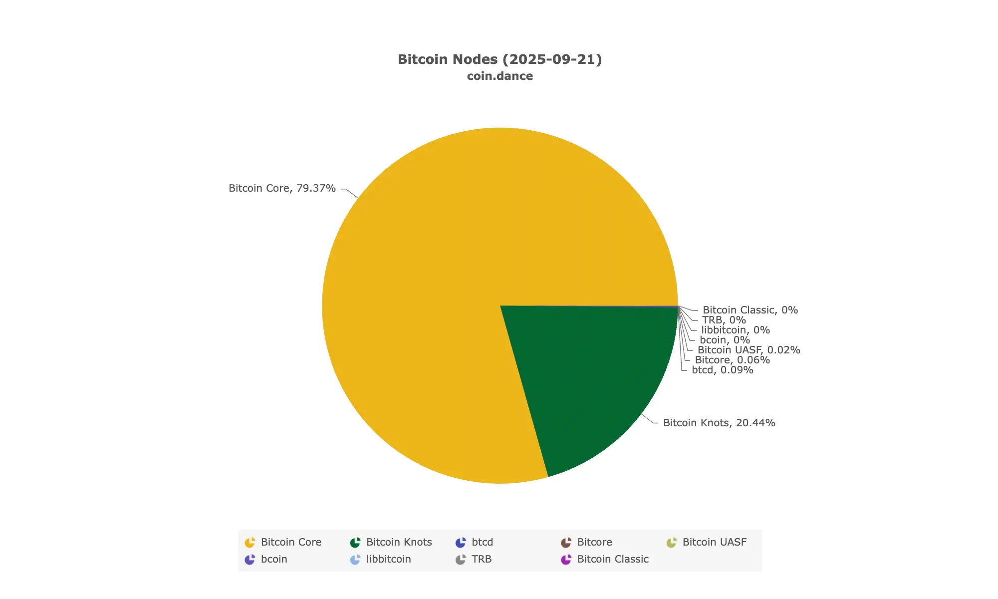 Этот резкий рост числа узлов, использующих Bitcoin Knots, представляет собой практически вертикальный скачок всего за девять месяцев. Сейчас они составляют около 20% сети по сравнению с примерно 1% в 2024 году.