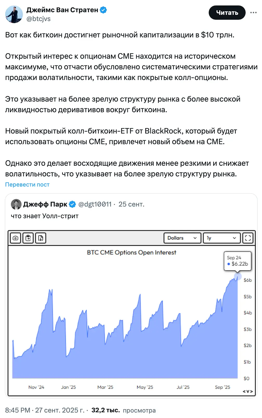 «Открытый интерес к опционам на CME находится на историческом максимуме, что отчасти обусловлено стратегиями систематической продажи волатильности, такими как покрытые колл-опционы. Это указывает на более зрелую структуру рынка с более высокой ликвидностью деривативов, связанных с биткоином», — написал Ван Стратен.