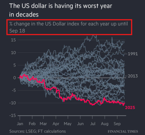 Американский доллар переживает худший год с 1973-го. По данным The Kobeissi Letter, индекс доллара (DXY) в первой половине 2025-го упал на 10,8%. Это рекордное снижение со времен краха Бреттон-Вудской системы и отказа США от золотого стандарта