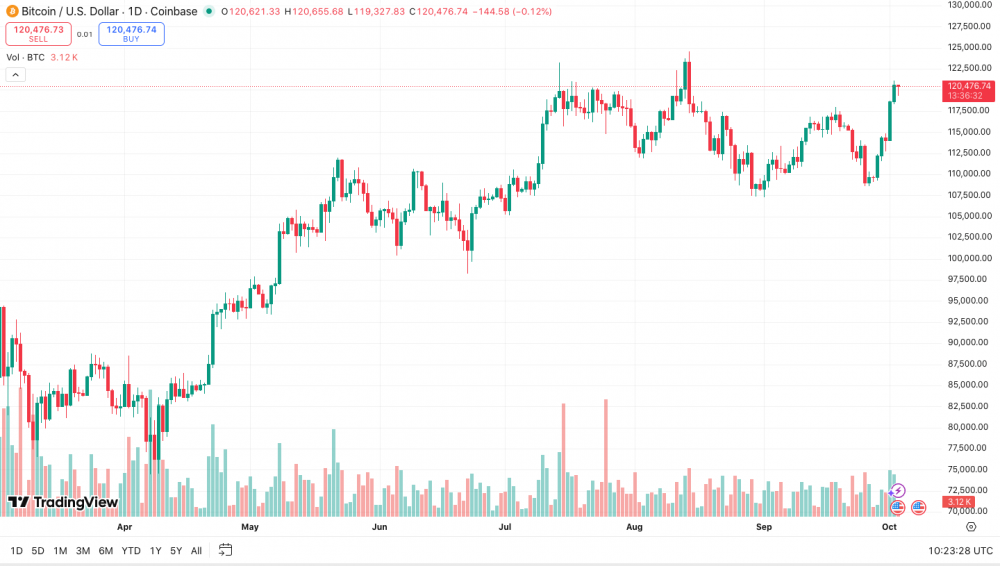 Цена биткоина взлетела на 4% за последние 24 часа. По данным TradingView, в четверг на Coinbase в начале торгов цена ведущего цифрового актива в мире достигла $120 450.