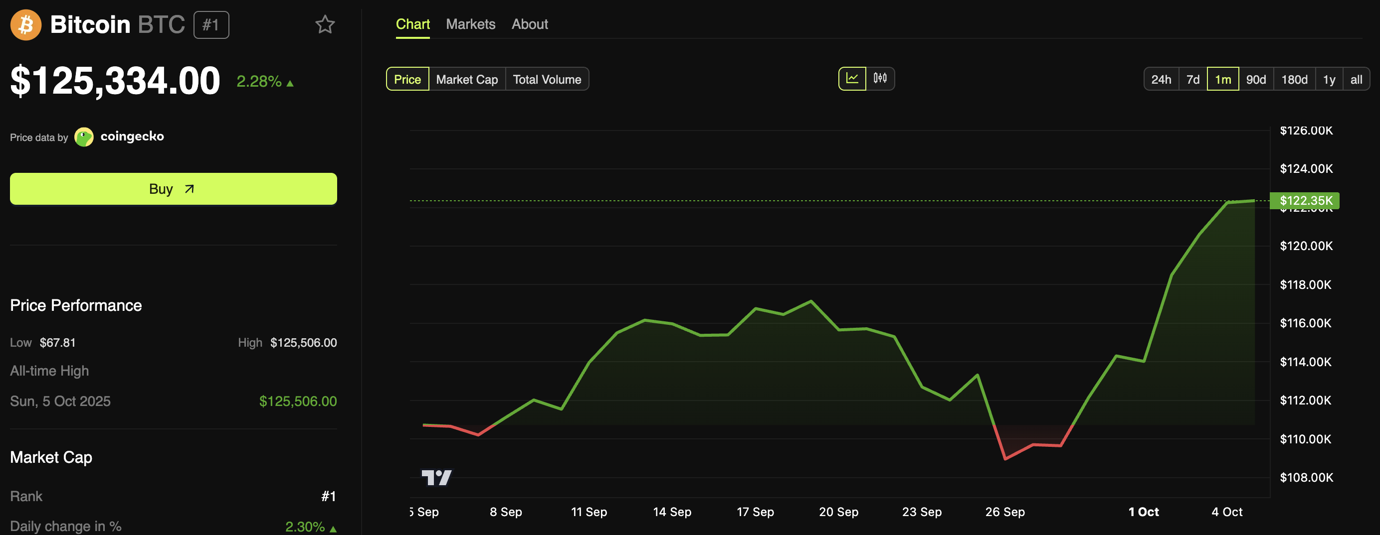 По данным BeInCrypto Markets, крупнейшая криптовалюта выросла более чем на 9% в этом месяце, установив новый рекорд. На момент публикации она торговалась по $125 334, что на 2,28% выше, чем накануне.