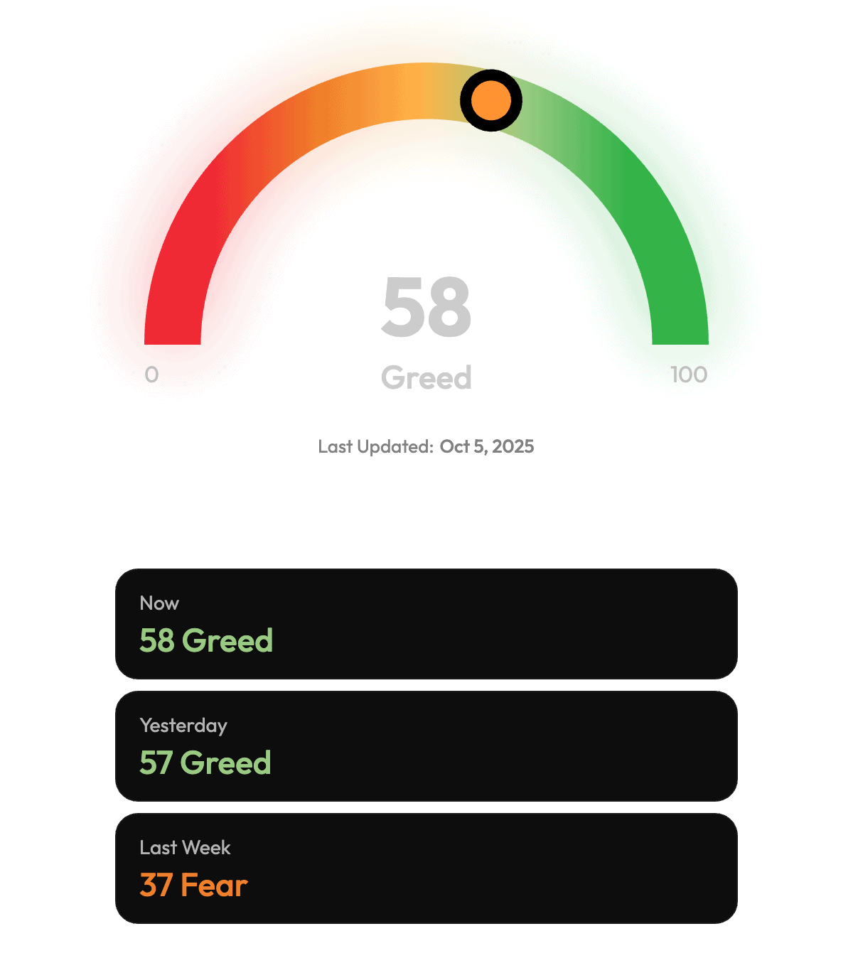 Индекс страха и жадности на рынке криптоактивов составляет 58 пунктов, что свидетельствует о преимуществе жадности. По сравнению с предыдущей неделей показатель вырос на 21 пункт.